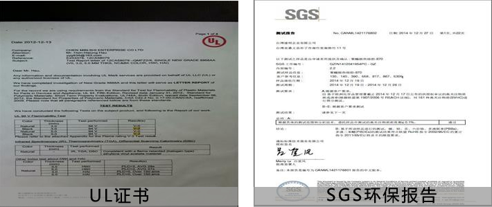 本公司还有:SGS 环保报告 卤 素 :4项 ROHS :10项 REACH:161项 每年都有测试认证美国安规UL 94V-0认证 。